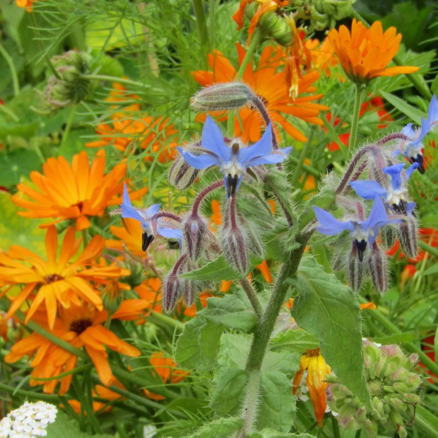 - Borage are lovely little blue flowers that will look super on cakes and desserts. They have a cucumber-like flavour – they’re a great addition to a gin & tonic!